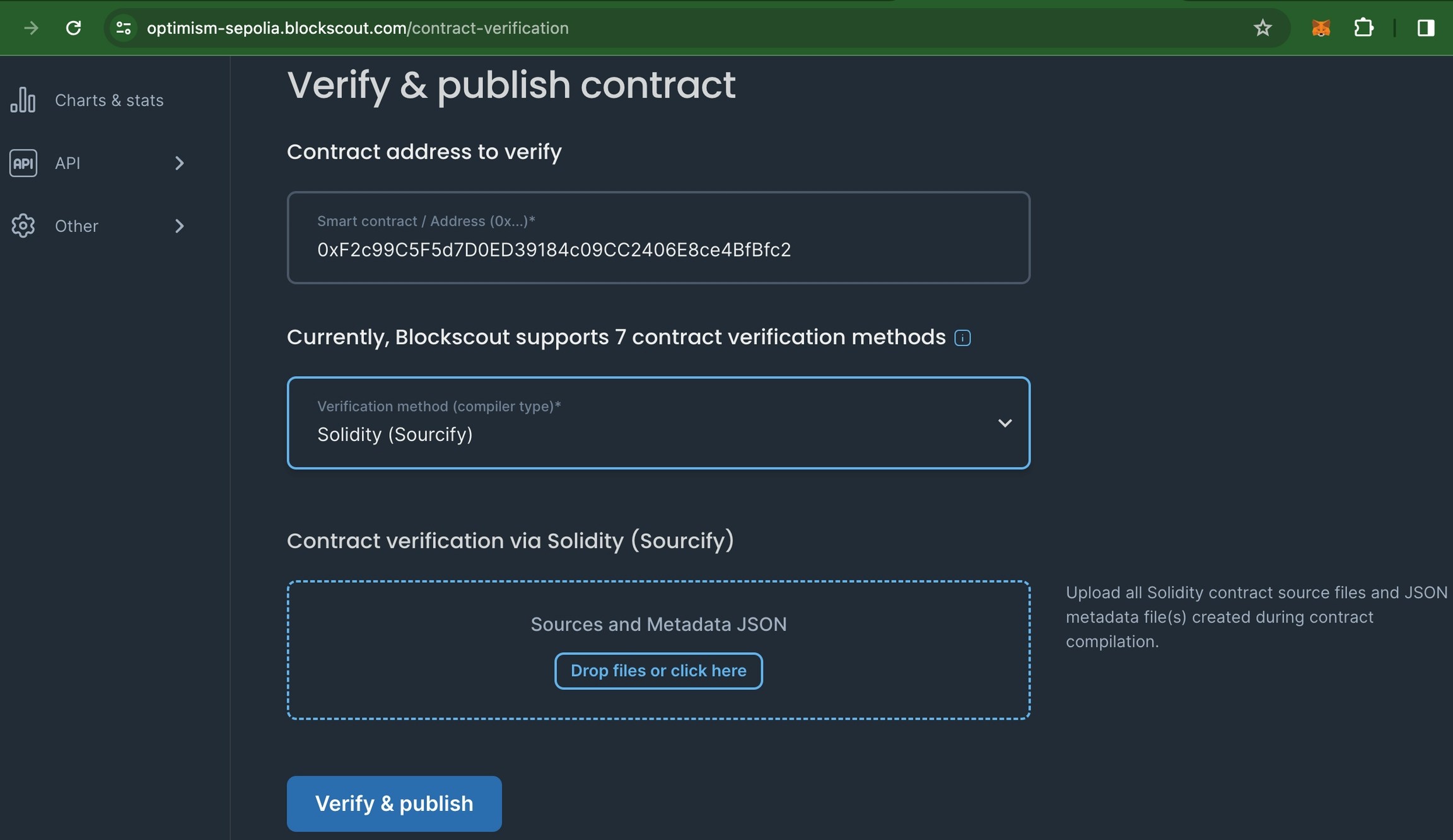 If your contract has linked libraries you should also drag & drop .json files _for those libraries. Once all files are added, start verification by clicking the _Verify & Publish button.