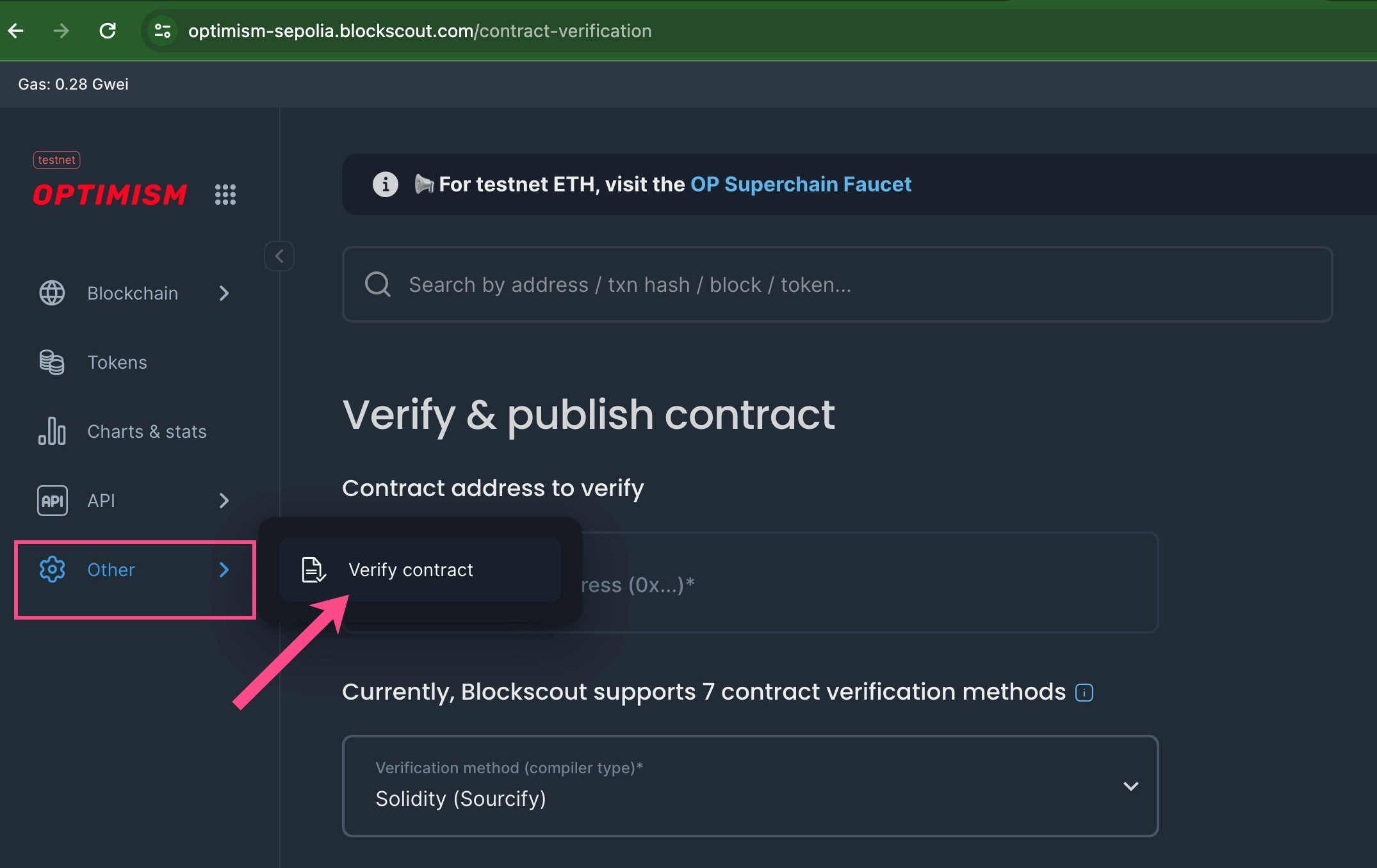 Verify your contract using Sourcify: 1) Go to the Verify contract page (Other -> Verify contract)