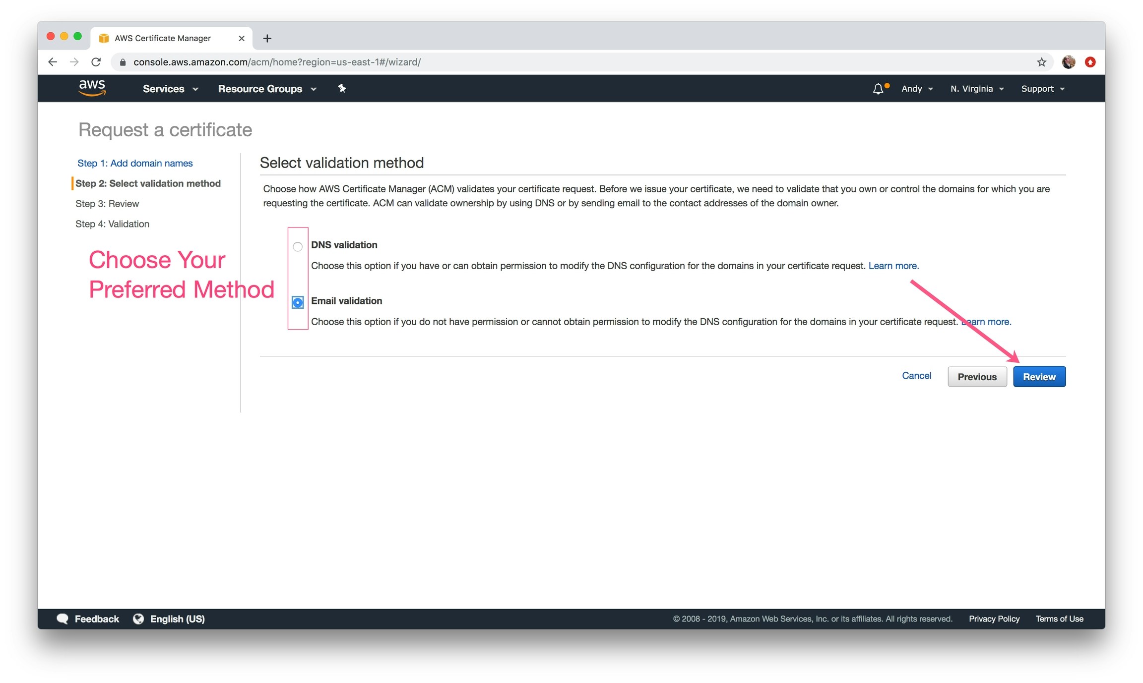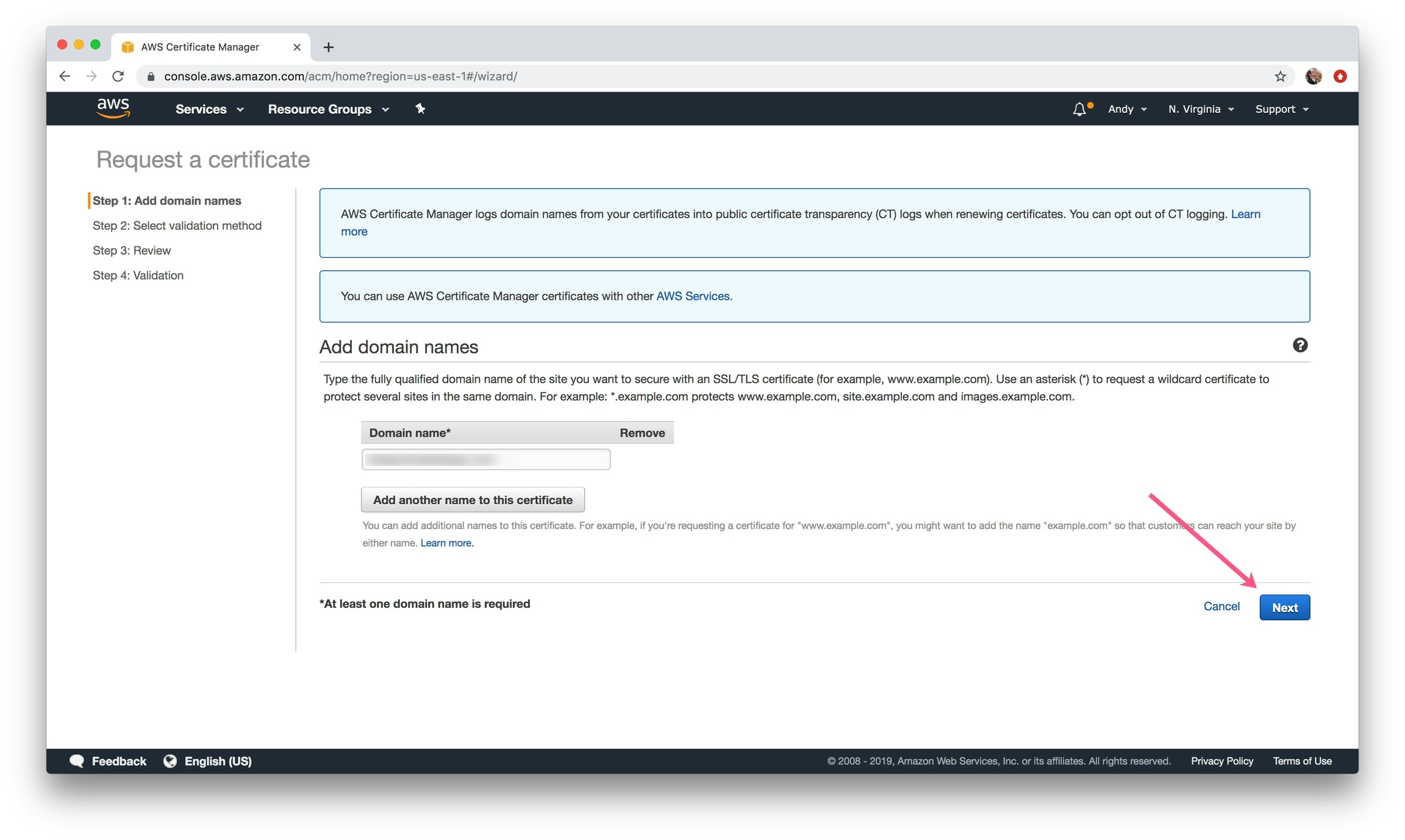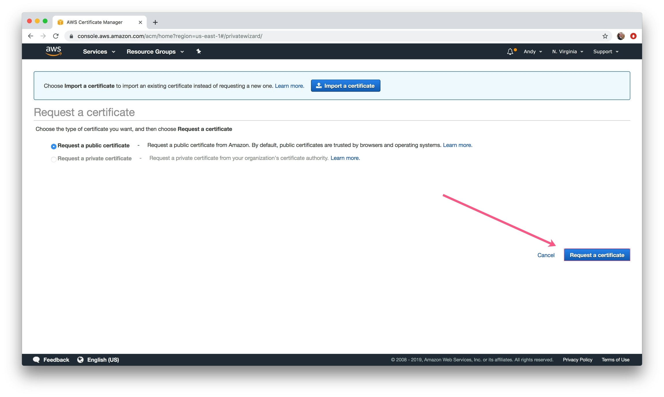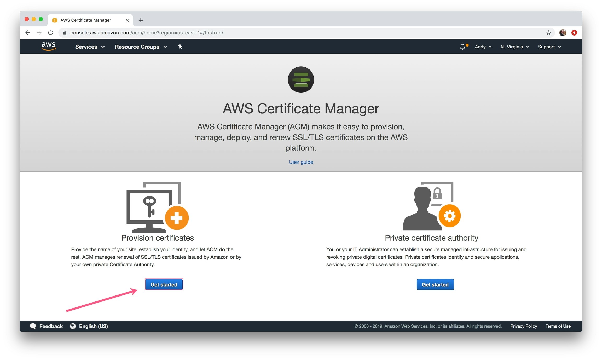 1) Go to https://console.aws.amazon.com/acm/. Select provision certificates and click on get started: