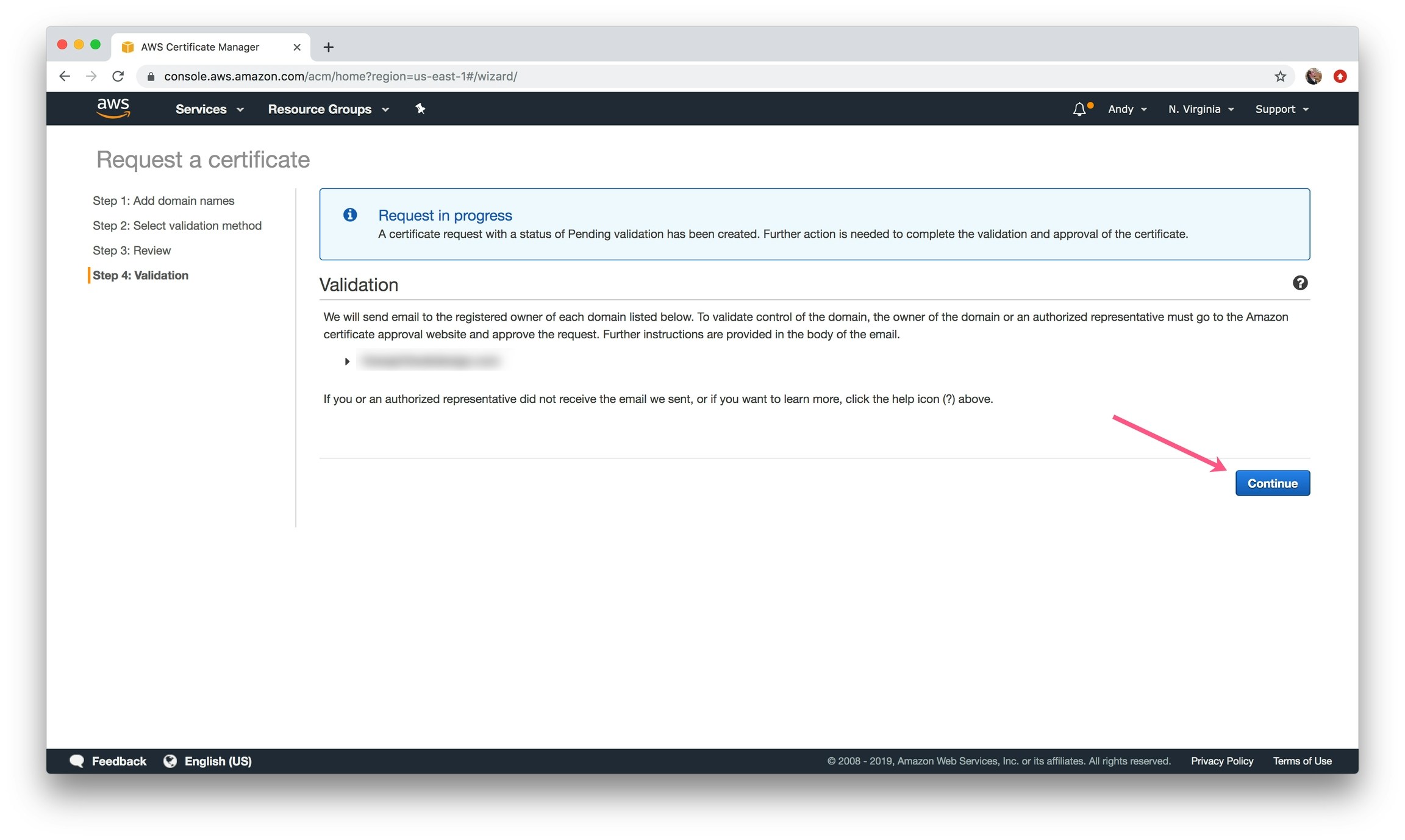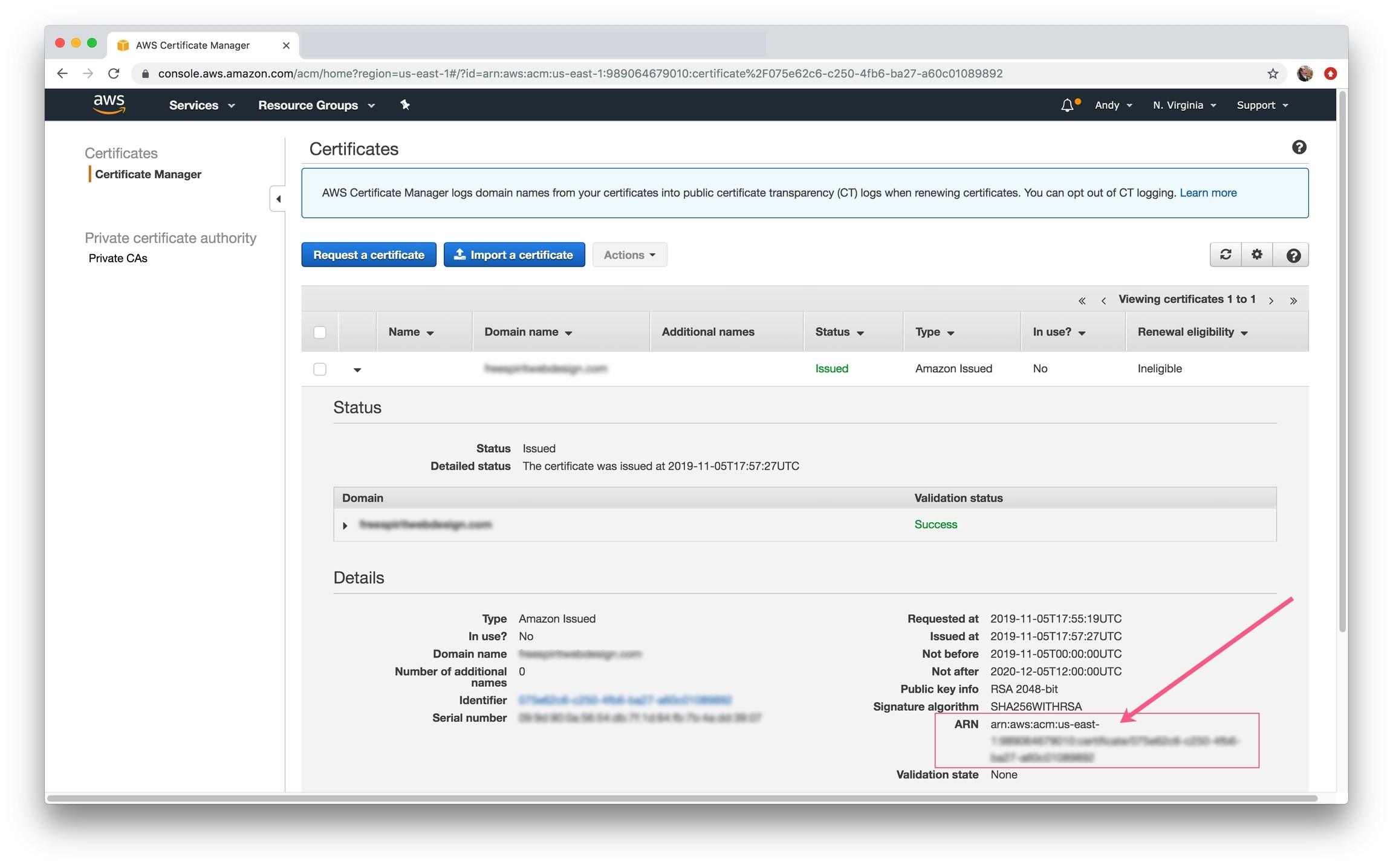 9) In the AWS Certificate Manager, click on the domain name to view the certificate details. Copy and paste your ARN into the alb_certificate_arn field in the terraform.tfvars file