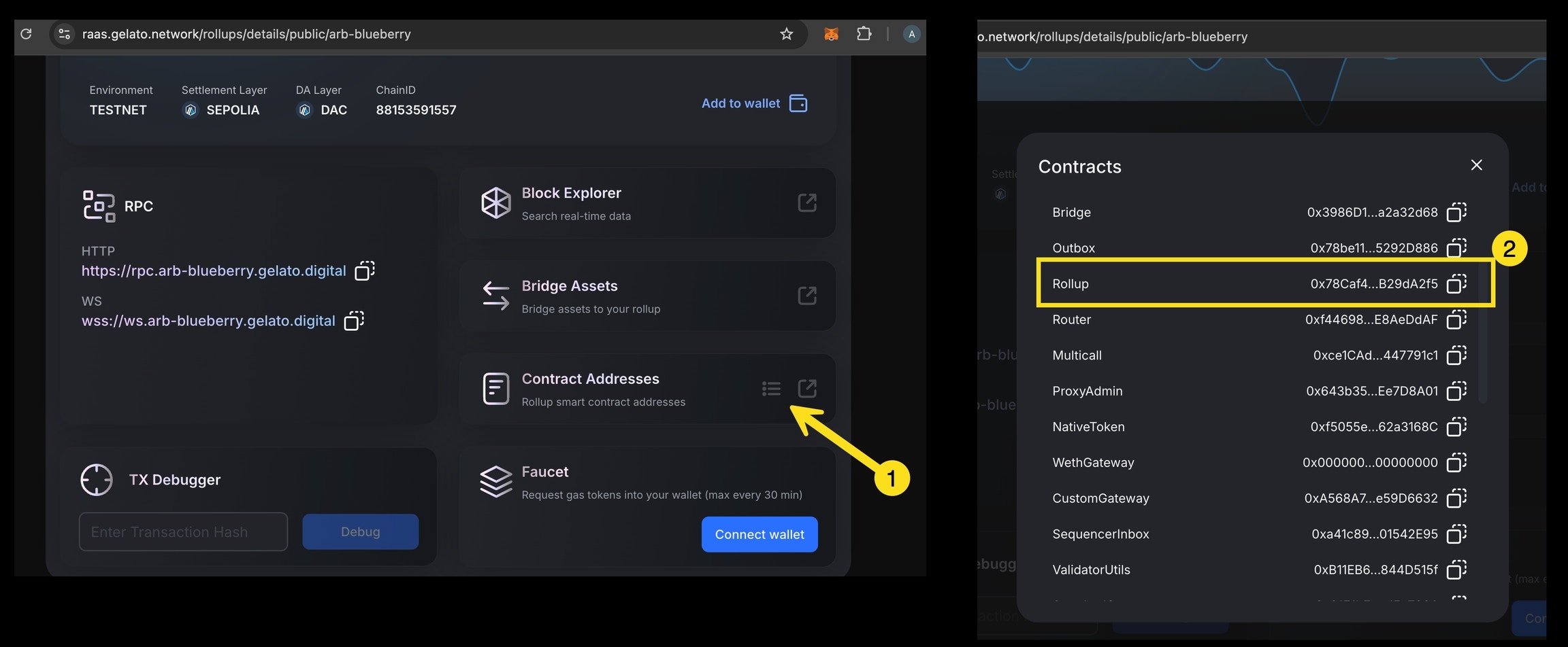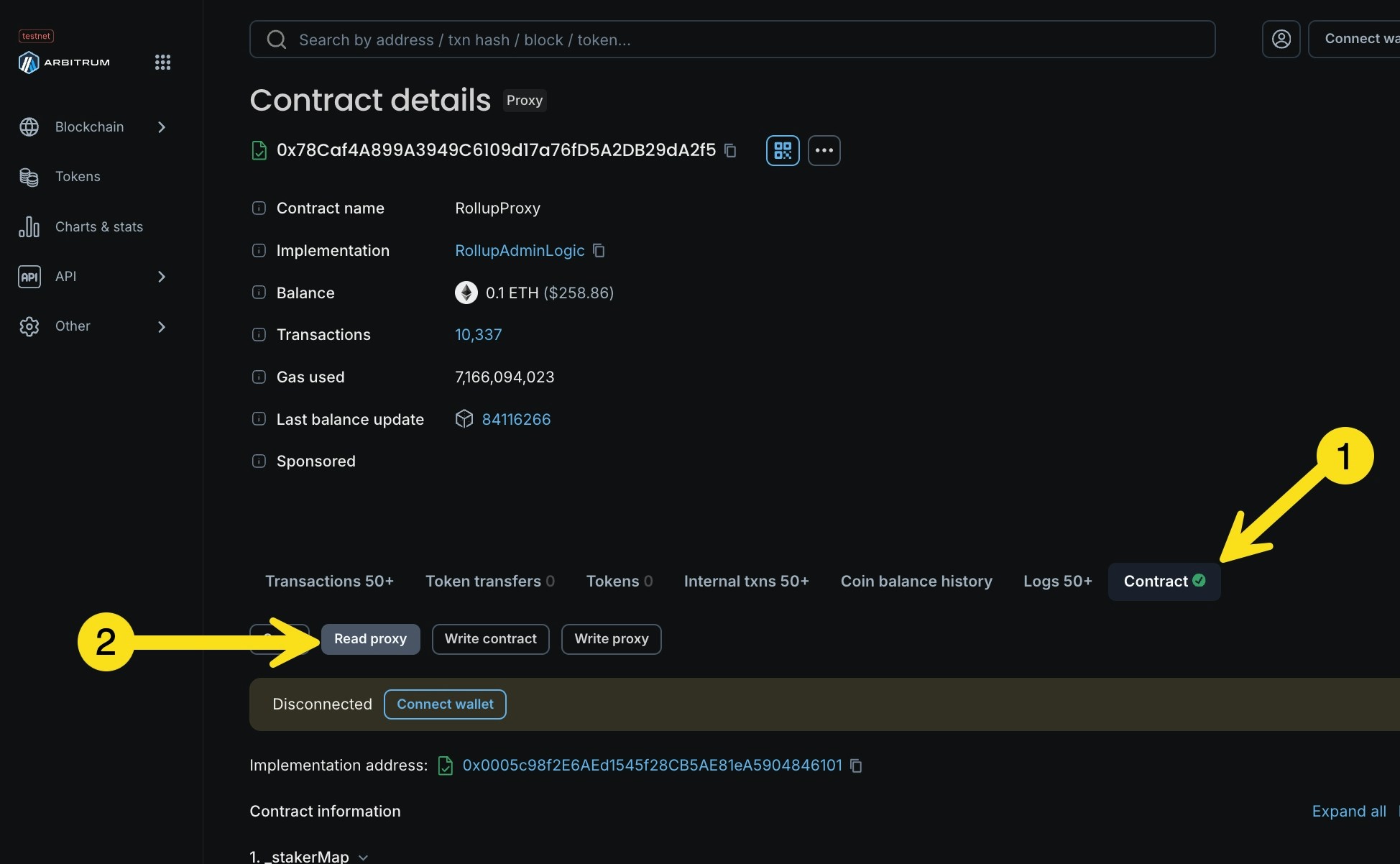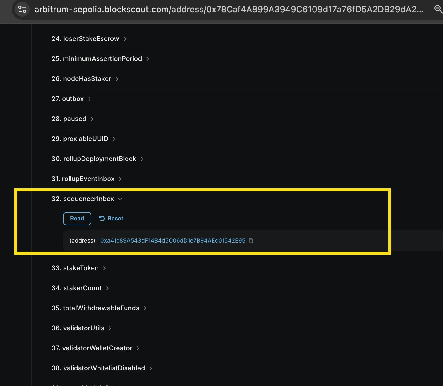 SequencerInboxcontract. To find the contract address, go theRollupcontract in the block explorer, go to read methods (or read proxy), and find theSequencerInboxmethod. This will display the address of the contract.