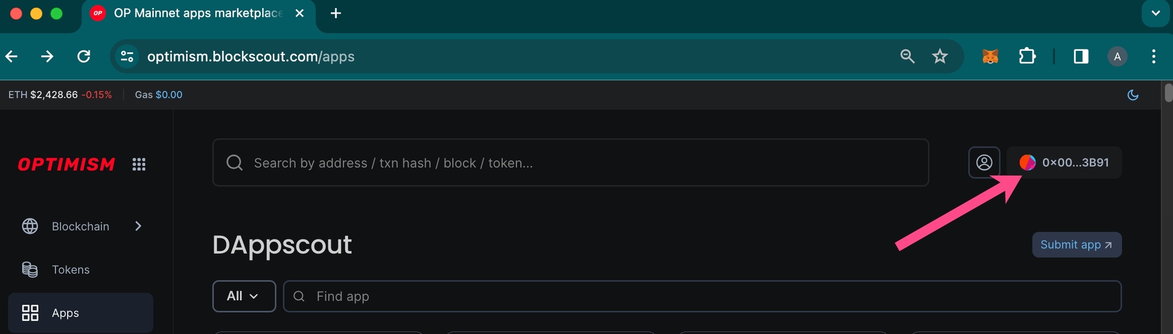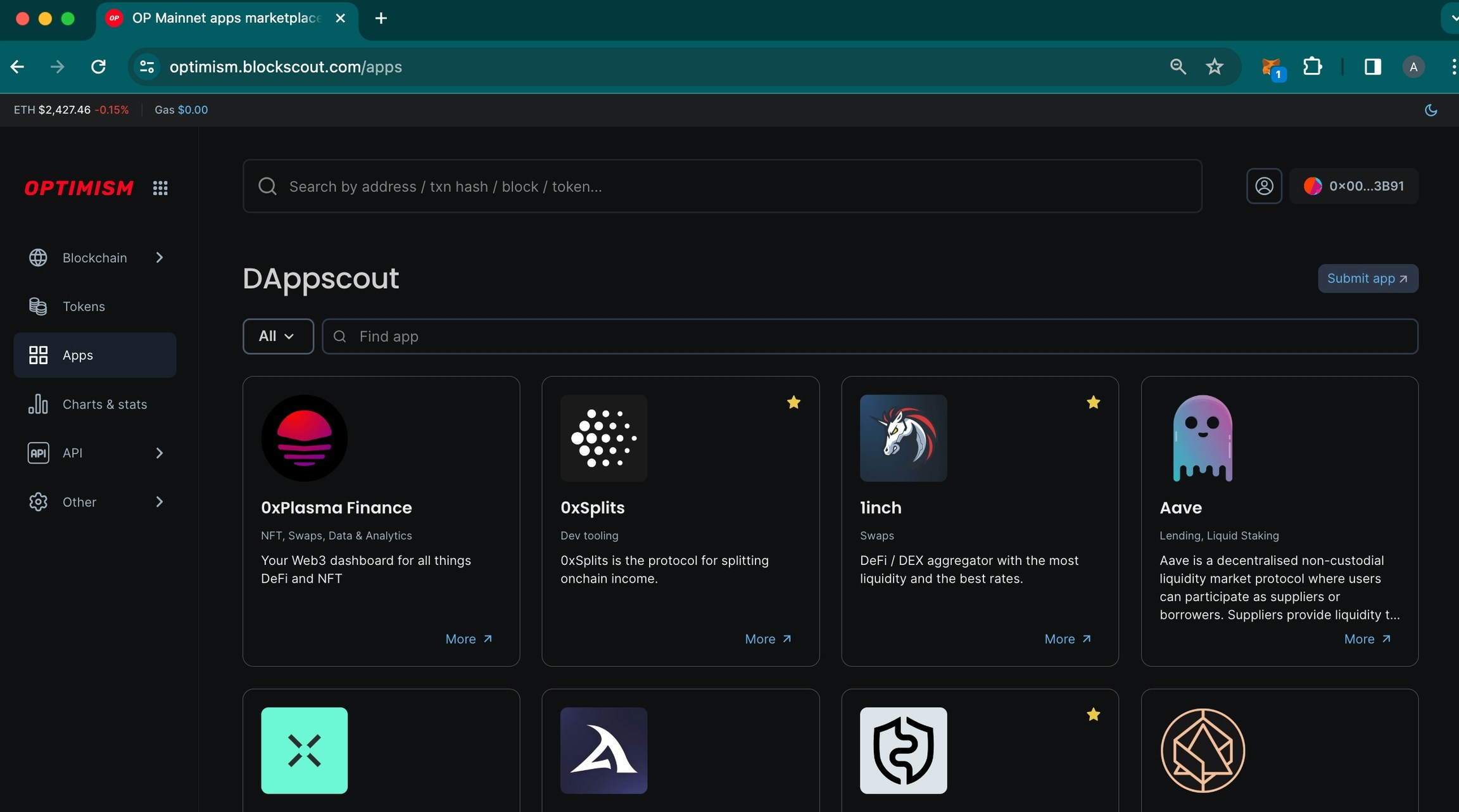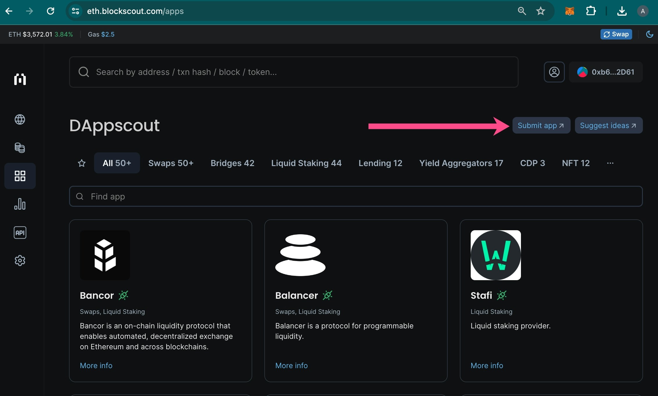Dappscout Apps Marketplace provides a curated list of apps available to on-chain users. Projects can submit their project for review, and once accepted, the project is listed in the marketplace.